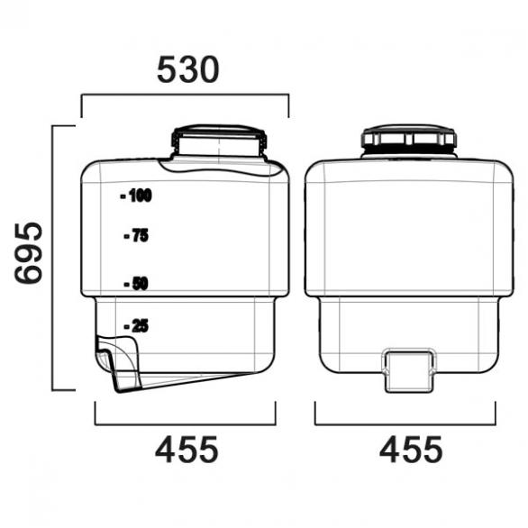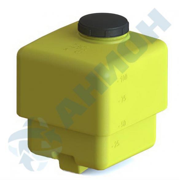 Емкость 120 л имеет дно с уклоном для обеспечения полного слива. На боковой поверхности пластиковой емкости нанесена условная градуировка объема. Емкость пластиковая комплектуется крышкой диаметром 200 мм. Под крышку емкости возможна установка фильтра заливной горловины.