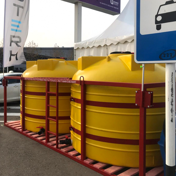 Новая модель транспортировочной кассеты для установки двух вертикальных бочек на 6000 литров. Конструкция имеет металлический настил и места крепления насосов, шлангов и запорной фурнитуры, а так же лестницу и съемную площадку для легкого доступа к заливной горловине – готовое решения для создания растворных узлов и специализированной сельскохозяйственной и коммунальной техники.